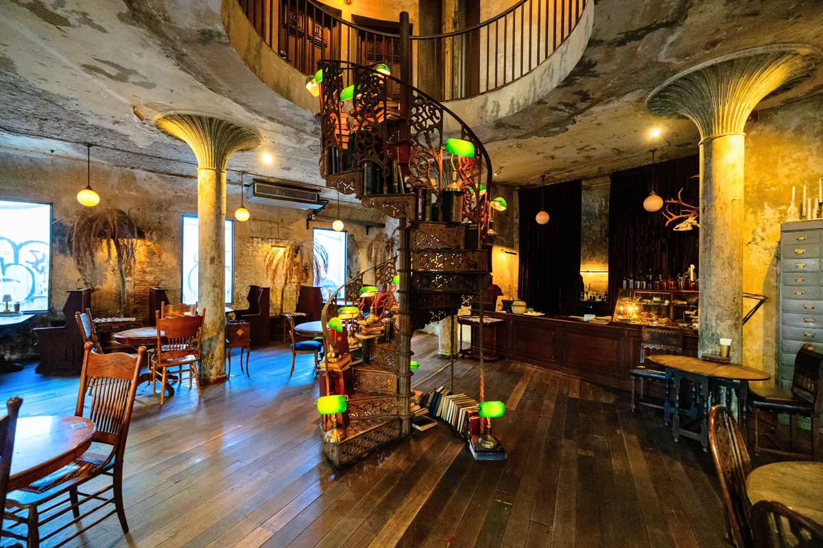 The centerpiece is a circular atrium that pulls daylight through the core of the building. A cast iron spiral staircase anchors the cafe & restaurant and climbs toward the guest floors. Common areas feel moody and cinematic. You move from shadow to light and back again as you pass arched doorways and tall windows. It is a style that invites slow mornings with coffee, a late afternoon break between outings, and plenty of photos. The hotel makes an impression as soon as you step through the door, but it is the smaller details that bring the story together. Door hardware, stone thresholds, framed art, and mismatched rugs add to the sense that this building has lived many lives.
